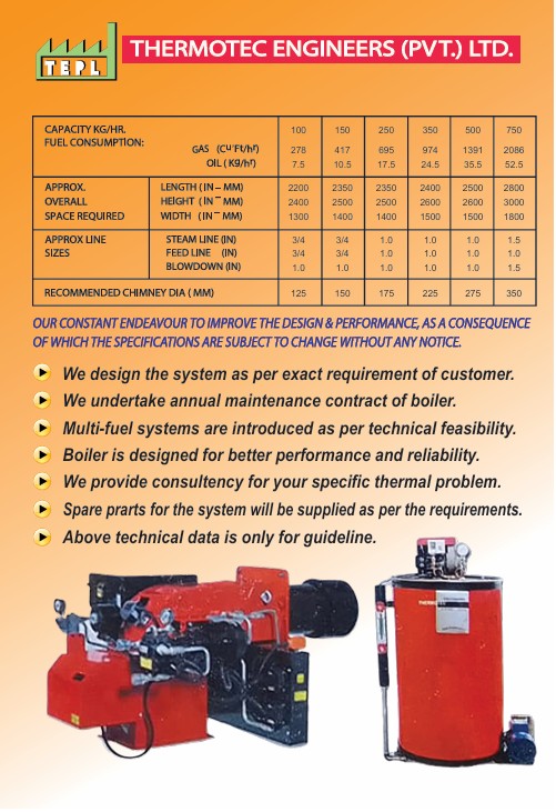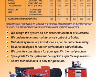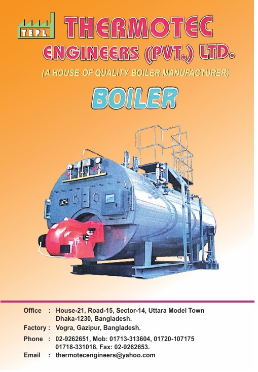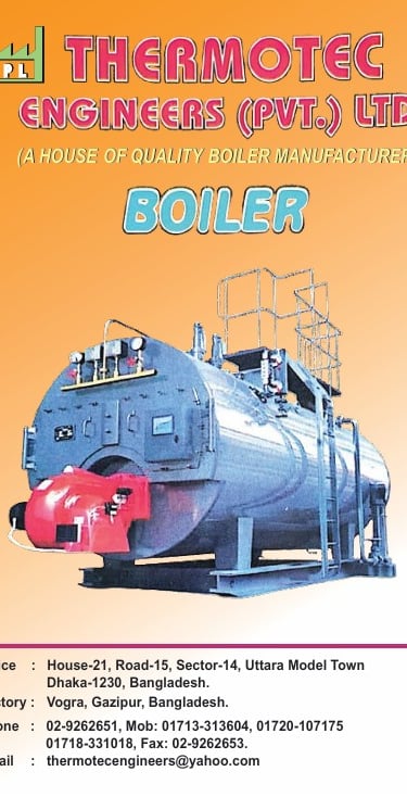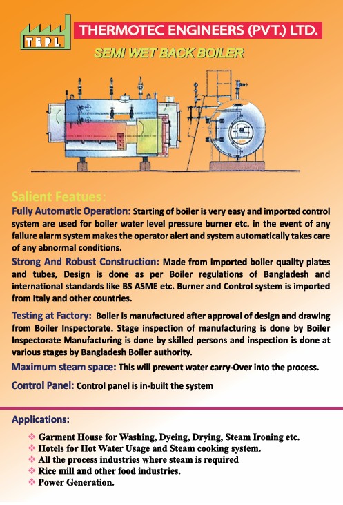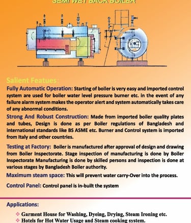 Strong And Robust Construction: Made from imported boiler quality plates and tubes, Design is done as per Boiler regulations of Bangladesh and international standards like BS ASME etc. Burner and Control system is imported from Italy and other countries.